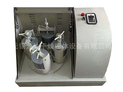 行星球磨機(jī)是在一轉(zhuǎn)盤上裝有四個(gè)球磨罐,當(dāng)轉(zhuǎn)盤轉(zhuǎn)動(dòng)時(shí),球磨罐隨著轉(zhuǎn)盤轉(zhuǎn)動(dòng),同時(shí)球磨罐在齒輪的帶動(dòng)下自身由中心軸帶動(dòng)作行星運(yùn)動(dòng),罐中磨球在高速運(yùn)動(dòng)中做不規(guī)則運(yùn)動(dòng)產(chǎn)生沖擊、剪切、研磨力達(dá)到研磨和混和樣品的目的。行星式球磨機(jī)能用干、濕兩種方法粉碎和混和粒度不同,材料各異的產(chǎn)品,效率高、效能大、研磨產(chǎn)品最小粒度可至0.1微米(即1.0×10-4mm)甚至納米級(jí)。