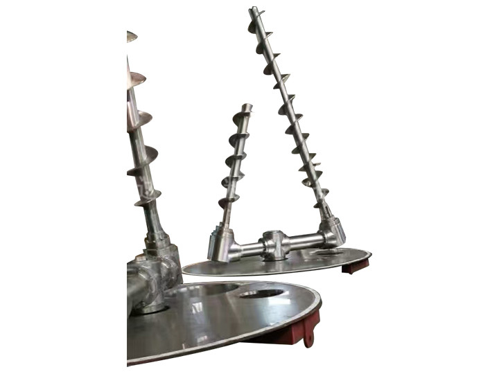 雙螺旋錐形混合機(jī)(雙螺旋混合機(jī))的攪拌部件為兩條不對(duì)稱懸臂(轉(zhuǎn)臂);不同長(zhǎng)度,它們環(huán)繞錐形容器的中心軸軸線轉(zhuǎn)動(dòng)(公轉(zhuǎn))的同時(shí),還借助轉(zhuǎn)臂下方兩根螺旋做自轉(zhuǎn)運(yùn)動(dòng);該設(shè)備通過(guò)懸臂與螺旋的公、自轉(zhuǎn)使物料反復(fù)提升實(shí)現(xiàn)混合目的。